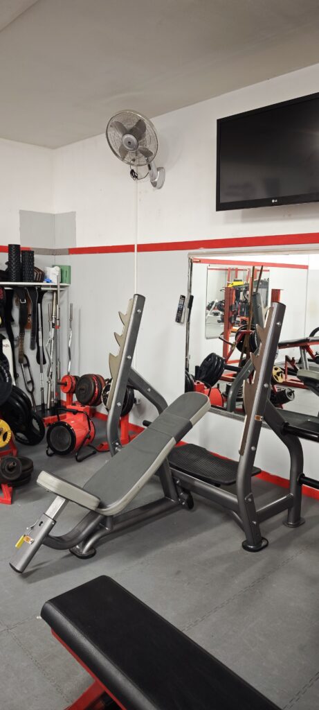 La première machine ( photo de gauche ) permet de travailler le haut des pectoraux à la barre en position inclinée.
